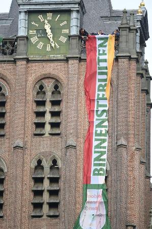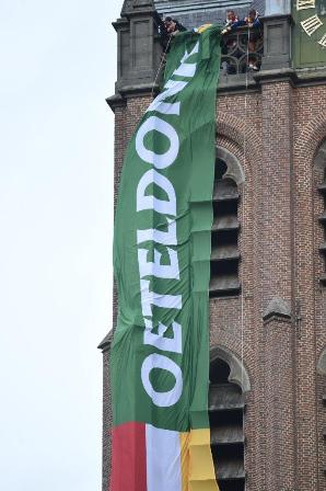 | De kleurrijke banier met Oeteldonks logo en tekst OETELDONK kwam maar moeizaam los van de toren. foto © paul kriele, 11 november 2019. ................................................................................. |