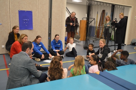 | De gymles begon met een instructie over deze bijzondere gymnastiekles door gymlerares Angela Groenwold en de twee gymstudenten Lisa Habraken en Femke van Gestel. Op de achtergrond links Monique Mallens [rode tru']van de afdeling Sport van de gemeente en schooldirecteur Anouk Schipper. foto © paul kriele, 13 november 2019. ......................................................................... |