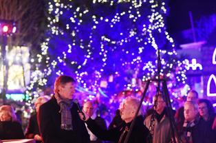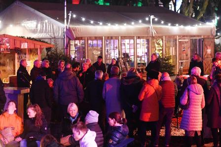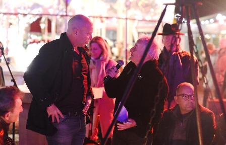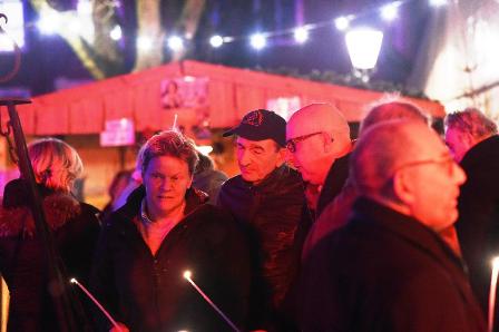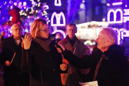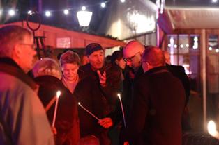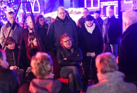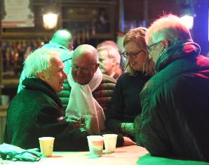 | -Hierboven: dominee Erica Scheenstra in gesprek met Theo Verbruggen. -Hieronder: Vertegenwoordigers van het COC onder wie Anja van Hout met onder meer Jack Mikkers [r.] en uiterst rechts Bart Eigeman. foto's © henk van esch, 24 december 2019. |
