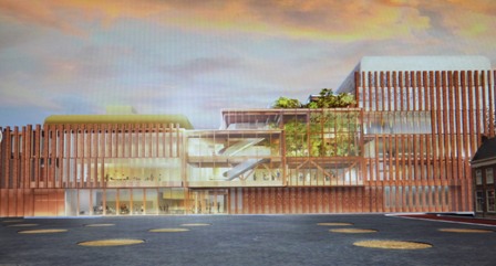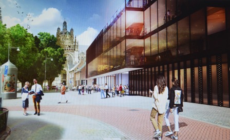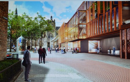 Hierboven: Het aangepaste ontwerp van NOAHH, waarop de glazen foyerpui is doorgetrokken naar het [rechter] deel van de theaterzaal en toneeltoren.