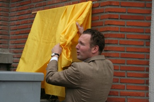 Links: het gebouw Sonneveld van 1938 en de nieuwe muursteen. Boven: de onthulling door wethouder Rodney Weterings. foto's © paul kriele [l] en Jos Peters [boven], 28 juni 2009. |