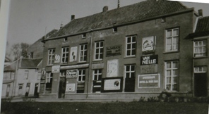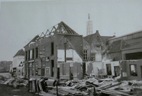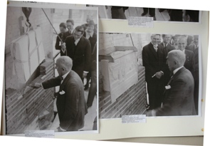 | Archieffoto's, die op de kleine expositie in de flat Sonneveld bgv de onthulling van de nieuwe muursteen, was ingericht. Links: burgemeester Frans van Lanschot metselt de -oude-steen in op 24 september 1938. Rechts: de oudbouw op de plek Sonneveld en de sloop in 1937. |