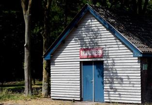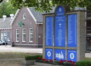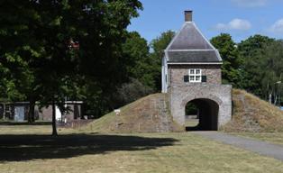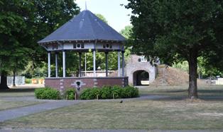 | Twee markante-naast de kannonen uiteraard - beelden van de kazerne: het poortgebouwtje dat een museum huisvest en de muziekkiosk voor het eertijds Korps Wielrijders . foto's © henk van esch, 28 mei 2020. |