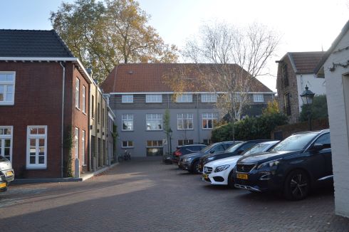 | Doorkijk in Hofje van Koolen gezien vanaf het Noorden. Op de achtergrond de Walpoort met sedert kort ICT-gebouw van JADS. Voorheen restant van Uilenburgklooster. |
