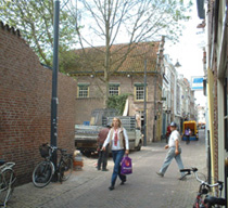 | Links de Snellestraat met achterin [voor het restaurant het Misverstant] naar links lopend het Begijnstraatje. Er werden op dat terrein diverse beer-en waterputten blootgelegd. foto's © paul kriele, 25 april 2005. |