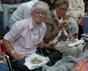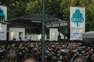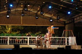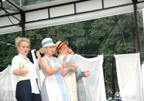 | Falstaff [Noé Colin] gaat op zoek naar zijn meiden..Karin Stgrobos als Meg Page en Anja van Engeland als Alice Ford . foto's © paul kriele, 8 juli 2009. | Boven het theaterpodium hielden ook zwermen spreeuwen het publiek af en toe bezig, maar ze maakten niet zulke mooie golvende bewegingen als vorig jaar. foto © ellen elemans 8 juli 2009. |