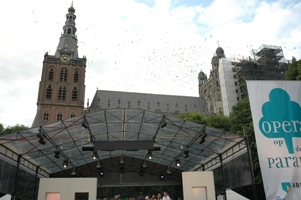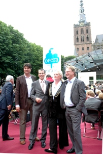 | Een officieel plaatje voor het Stan Huygensjournaal van de Telegraaf met vlnr. Paul du Crocq hoofd stadsmarketing Cultuur Harry Vermeulen, directeur TheateradParade, Miranda van Kralingen en Arthur van Dijk, directeur van Het Brabants Orkest, Links achter de regulerende StanHuygens-redacteur Wim Kool, voorheen Brabants Dagbladreporter. foto © paul kriele, 8 juli 2009. | ![]() |