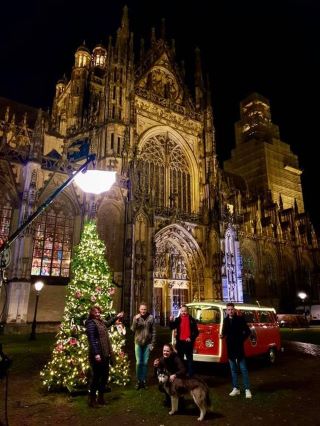 Vrijdagmiddag 18 december 2020 werd in op het Sint Janskerkhof [Noordzijde] de film opgenomen voor de Kerstformule* van KRO/NCRV met Joris Linssen die door het land trok om in diverse plaatsen bij zijn mini kerstboom kerstverhalen/kerstwensen op te nemen. Door corona gebeurde dat in alle stilte zonder publiek, en maar een paar kandidaten. Die kerstroute legde Linssen af met zijn bekende rode Volkswagenbusje die naast de mini kerstboom bij het Noorderportaal van de Sint Jan geparkeerd werd.