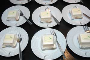 | Gebak in Motel Vught bij de ontvangst en eerste toespraken rond de start van de aanleg Randweg. - foto's © paul kriele, 25 april 2008 |