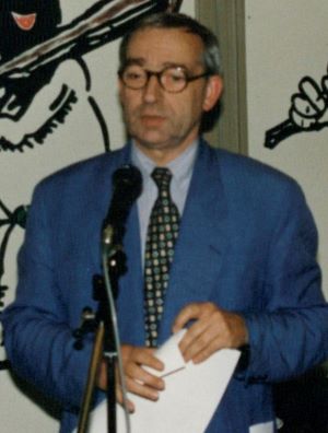 Hein Kurvers in een toespraak bij de opening van de expositie 'Station/La Gare' in de Knilispoort. foto © rob hoogeboom, 10 september 1993. |