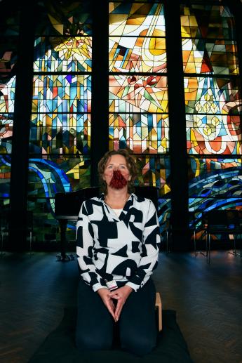 Kunstenares Mariëlle Lapidaire exposeert mondkapjes in het ziekenhuis