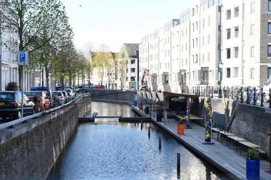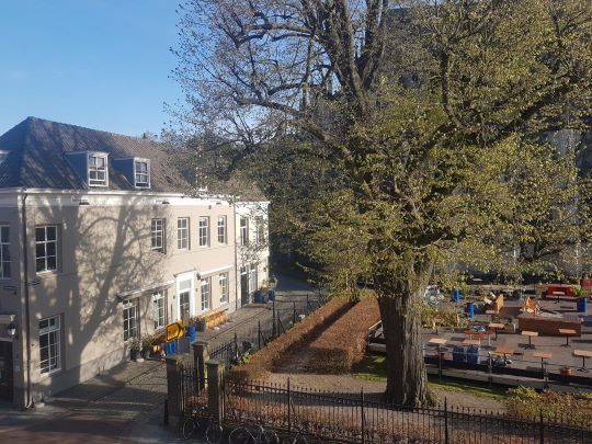 | Het riante terras bij het Rugbyveld, uitkijkend over de stadsgracht en gelegen aan de Limietlaan. foto © henk van esch, 22 april 2021. |