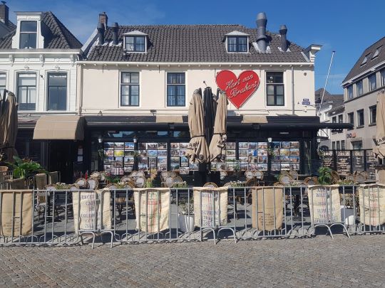 | Parade met het Hart van Brabant dat behalve een aangekleed terras ook de zakken van de leverancier, Koffiebranderij Nieuwkujk, heeft opgehangen. Want directeur De Laat gaat de Bossche horeca voortaan van koffie voorzien. foto © henk van esch, 27 april 2021. |