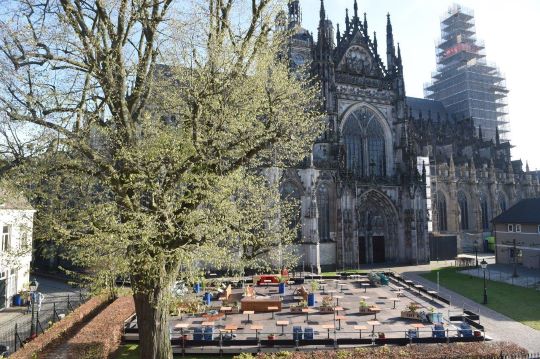 | Situatie op 28 april 2021 van het terras op het Sint Janskerkhof bij de Noorderpoort van de Sint Jan. foto © henk van esch, 28 april 2021. |