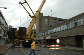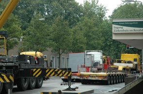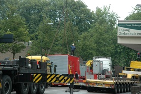 | Er viel op deze zondagmorgen rond het ziekenhuis weinig publiek waar te nemen. Dit is een ploeg van 10 bewoners van de Klinische Revalidatie. De laagbouw aan de Tolbrugstraat moest als enig deel van het ziekenhuis ontruimd worden. | Om even over achten stond het eerste aggregaat al op zijn plaats op het binnenplein. Rond kwart voor negen ging de tweede de lucht in. foto's © paul kriele, 19 juli 2009. |