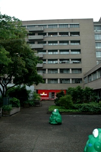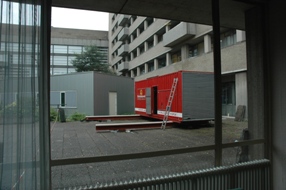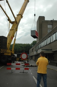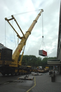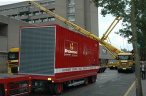 | In de zuid-west hoek van de binnentuin kregen deze kanjers een nieuw leven. Bij nood kunnen ze het hele ziekenhuis van stroom voorzien. | Hieronder het optakelen en het over het over het dak hijsen van het tweede aggregaat. foto's © paul kriele, 19 juli 2009. |