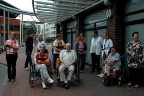 Op de achtergrond volgde een groep van 10 bewoners van de Klinische Revalidatie de imposante klus. Dat deel van de laagbouw, aan de zijde Tolbrugstraat, moest worden ontruimd.
