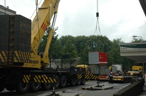 | De Tolbrugstraat was - officieel - tot twaalf uur afgesloten. Maar gezien het voorspoedig verloop van het werk kon dat wel eens eerder worden. | De aggregaten komen van www.bredenoord.com Het takelbedrijf was Nederhoff uit Gouda. |