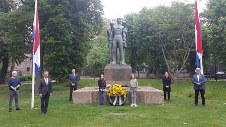 | Een moment van de herdenkingsdag op 4 mei 2020 in de Casinotuin. Bij dit monument en het Joods scholierenmonument komt ook een muur met daarop ruim 900 namen van militairen en Bossche oorlogsslachtoffers. foto © henk van esch, 4 mei 2020. |