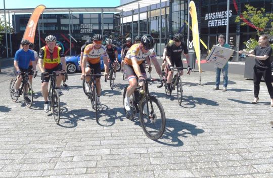 Ceremoniële start wielrenevenementen bij sporthal Maaspoort