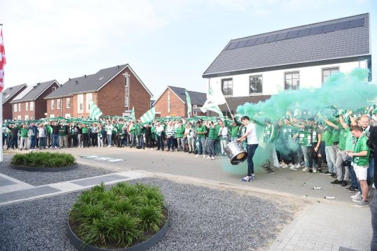| Een lange stoet van supporters en clubleden van EVVC trok naar het sportpark de Zwaan in Vinkel. Uitgerust met vlaggen en vuurwerk werd voor Frans' huis een ere-groet gebracht. foto's © henk van esch, 24 juni 2021. |