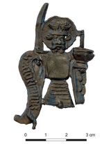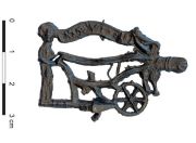 | -Hierboven: Houten beschoeiing van de Mortelgraaf. -Hieronder: Rechts religieus insigne met Adrianus Geraardsbergen als ridder en links een boer [links] met trekdier aan de ploeg en een phallussymbool [rechts] voorop. .De insignes werden verkocht op jaarmarkten en kermissen. foto's © erfgoed, 2020. |