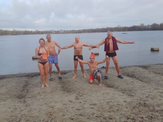 | Stoere zwemmers aan de Oosterplas die op 1 januari 2021 de koude en ook corona trotseerden. foto © henk van esch, 1 januari 2021. |