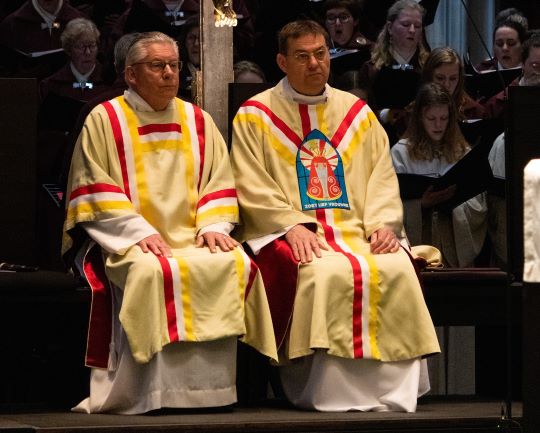 | -Hierboven: Plebaan Vincent Blom liet in 2019 speciaal voor deze gelegenheid een Oeteldonks kazuifel maken met in het logo een verwijzing naar de Zoete Moeder. Links diaken Palte. -Hieronder:Plebaan Blom toont het nieuwe carnavalskazuifel aan Peer van den Miuggenheuvel. foto's ©wim koopman, 3 maart 2019. |
