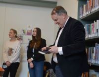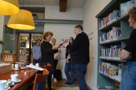 | Het welkom door directeur Nan van Schendel van Huis73. Van Schendel nam de gelegenheid te baat om de vertrekkend wethouder Huib van Olden een cadeautje te geven. foto's © paul kriele, 29 maart 2022. |
