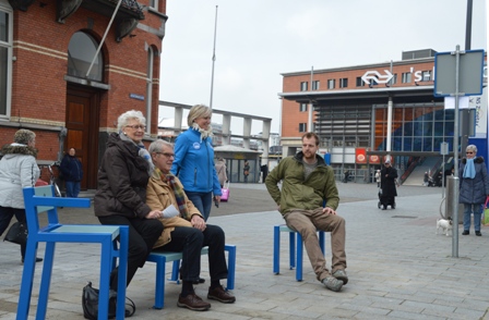 Stationsplein waar in maart 2018 als eerste een set Blauwe Stoeltjes werden geplaatst. Rechts de ontwerper en de bedenker ervan Wouter Corvers. foto © paul kriele, 29 maart 2018 |