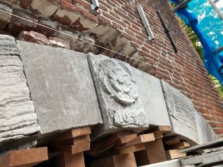 | -Hierboven:.Het poortje in de Uilenburg behorend bij de vroegere wijnhandel van Filips van Beugen woonachtig op Postelstraat 46-48 Het gaf vanaf 1681 toegang tot de schuilkelder in het op het erf staande wijnpakhuis. -Hieronder: Deze sluitstenen worden deels weggehaald om het metselwerk er boven te kunnen herstellen. foto's © paul kriele, 18 juli 2022 en © De Bont [foto onder]. |