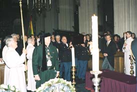 De eerste rij in een redelijke volle kathedraal met onder meer -vlnr- een van de zonen van oud-burgemeester Ben van Zwieten, Ben van Zwieten, commissaris der koningin Hanja May-Weggen, de Roemeense ambassadeur I.Buga en burgemeester Ton Rombouts. |