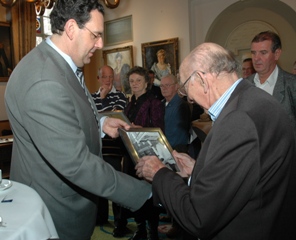 René [l] en Frank [r] Liebregts bij hun moeder Annie Hanegraaf -Dupuis, dochter van Frans Dupuis ontvangen het cadootje met een opa Dupuis van wethouder Bert Pauli.. foto's © paul kriele, 29 oktober 2009. |