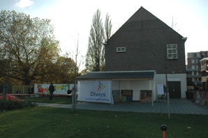 | Het jeugdhuis Het Honk aan het Schakelplein in de Bartjes waarvan de beheerders Dave Verbruggen, Jos Brouwer en Nees Grunderbeek het project facilitair ondersteunden. | De achterkant is de oefenwand die telkens wordt schoongemaakt zodat de jeugd zich daarop blijvend kan uitleven. |