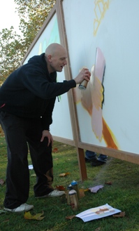| Onder begeleidend oog van de graffitydeskundige Antoine Duimel gaat er er op los. foto's © paul kriele, 8 november 2009. |