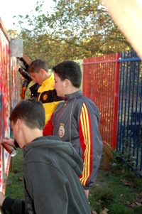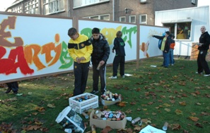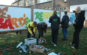 Hier zijn jongeren van de Bartjes druk aan het oefenen voordat ze de voorkant van die wand mogen gaan bewerken. Links: graffitykunstenaar Antoine Duimel. foto's © paul kriele, 8 november 2009. |