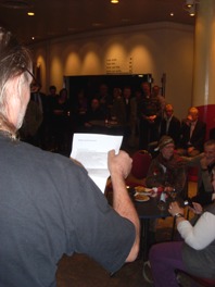Gé van Berkel draagt ode voor bij afscheid van Hennie van Rijnsdorp van de artiestenfoyer. foto © paul kriele, 12 oktober 2009. |