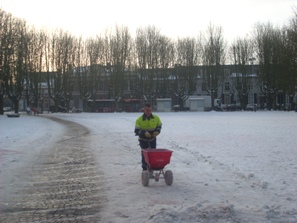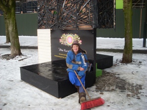 Imke van Dillen licht in de, zoals ze noemt, hokhut dit nieuwe kunstwerk van 'Paradeverhalen' toe. In deze herberg Ónze Jeroen' kun je je belevenissen ervaren en/of delen met anderen. Intussen maakt Andy Bach van de Weener groep de Parade sneeuwvrij, zodat het labyrint ook zichtbaar wordt en zijn functie in de opstelling behoudt. foto's © paul kriele, 24 december 2009 |