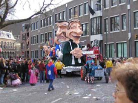 | De realiteit van het hiervboven afgebeeld ontwerp Carnavalswagen vande Grapjassen in 2004 op het Kardinaal van Rossumplein de figuur voorop is plebaan Bodar en daarachter burgemeester Rombouts. © foto Willy Kersten,23 februari 2004. |