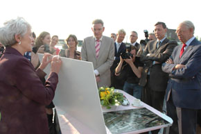 | Het moment waarop minister Jacqueline Cramer de cheque van 13 miljoen aanbiedt aan wethouder Geert Snijders [m]. Uiterst rechts Henk de Heus, vader van Co en Koen die ook aanwezig waren. foto's © paul kriele, 30 juni 2008. |