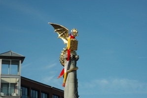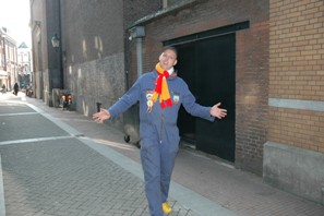 | De Draak voor het station, die tegen de kou beschermd wordt door het 'rood wit en geel'. | Een loslopende Oeteldonkse boer in de Gasselstraat op zoek naar zijn club CV de Mafkikkers. |