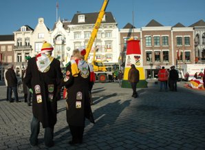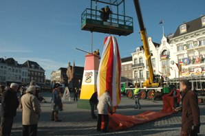 | Van Lijssel vervoerde h'm naar de Markt en... | Kraanbedrijf Saen hees h'm naar boven. |