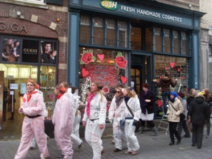 | Een groep carnavalsmeiden in overall voor zeepwinkel Lush op de Hooge Steenweg. Op de ruiten staan tientallen handgetekende Valentijnswensen. foto © paul kriele, 13 februari 2010. |