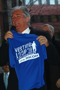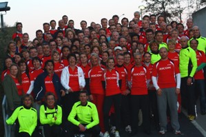 | -Directeur Carol Dona toont het nieuwe shirt van de vestingloop 2010. ' -Links boven: De eerste training voor medewerkers ging van start onder professionele begeleiding van Olga Commandeur. Zij verzorgde op het parkeerdek van Ricoh de warming-up zoals we deze kennen van haar dagelijkse optreden in het tv-programma “Nederland in Beweging”. -Links: het team van Ricoh dat met hardlopen of wandelen in training gaat voor de vestingloop op zondag 30 mei 2010. |