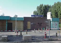 | Met rood/wit lint heeft de politie het centrum afgesloten iedereen die zich erachter begeeft wordt volgens de algemene politieverordening [ art. 10 lid 3], gearresteerd. | Cafetaria De Berehap waarvan eigenaar G.de Mol aankondigde te gaan verhuizen naar de Haren. foto's © gerard monté, 14 augustus 2003. |