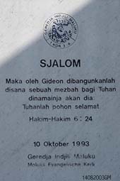 Hierboven de muur-en gedenksteen van de Sjalomkerk van de Moluks Evangelische Gemeente, gelegen tegenover de Ploossche Hof. |
