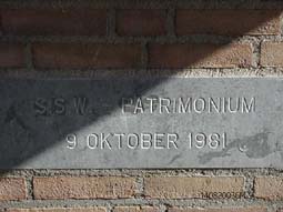 | Hierboven: De muursteen die verwijst naar de eerste steenlegging op 9 oktober 1981. Rechts: De flat van Patrimonium [tegenwoordig SSW]. |