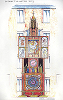 Op de top geven op bazuinen spelende- en ook weer bewegende - Engelen op elke uur de tijd aan, waarmee wordt gerefereerd aan het Laatste Oordeel. De spelende engelen vormen het signaal waarop het figurenspel eronder zich in beweging zet.