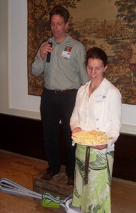 | Joris en Marcha Mathijsen uit Udenhout leiden een kaasboerderij in Udenhout dat 100 melkkoeien heeft. Die produceren uiteindelijk voor boerenkaas en roomboter. De Marthijssens deelden aan de gasten Boeren Leidse 30+ kaas en de nieuwe Joris 35+ kaas uit. foto's © paul kriele, 7 mei 2010. |