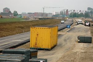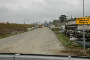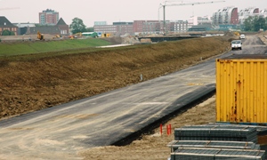 Het tracee van de Randweg richting Willemspoort en Paleiskwartier. De geluidswallen liggen aan de linker/Westkant en aan de rechterkant/Oostkant. |